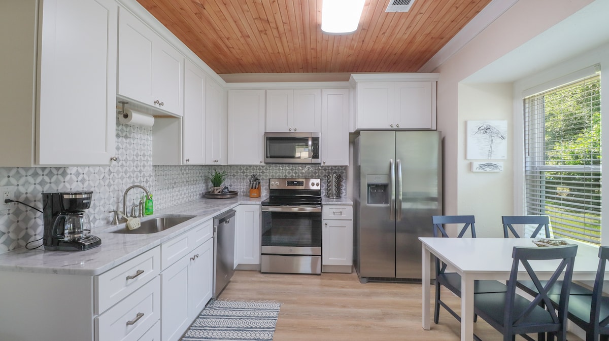 Disfruta de una experiencia elegante en este alojamiento céntrico de 1 dormitorio y 1 baño en Gulfport. El espacio tiene capacidad para 4 personas con una cama tamaño king y un colchón tamaño queen. La sala de estar está equipada con un televisor inteligente de 60 pulgadas. Inicia sesión y transmite con aplicaciones como Netflix y Hulu. La cocina está totalmente equipada con todos los elementos necesarios para cocinar. Impresionante ubicación a pocos pasos del acuario MS, Jones Park y el centro de Gulfport.
