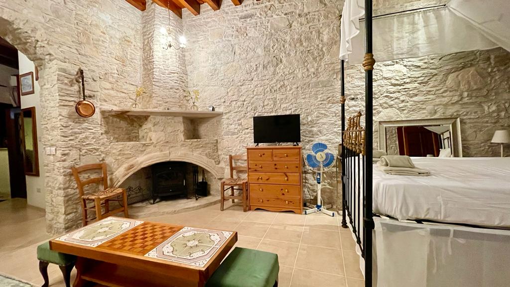 This unique place has a style all its own. Palatoui Executive suite is one of our recent additions, and one of the most favorable rooms. It combines modern and traditional style with glass, metal and stone details. On the ground floor you will find an in-built jacuzzi, a fireplace, the sitting room and the fully equipped kitchen. On the top floor is the bedroom and bathroom