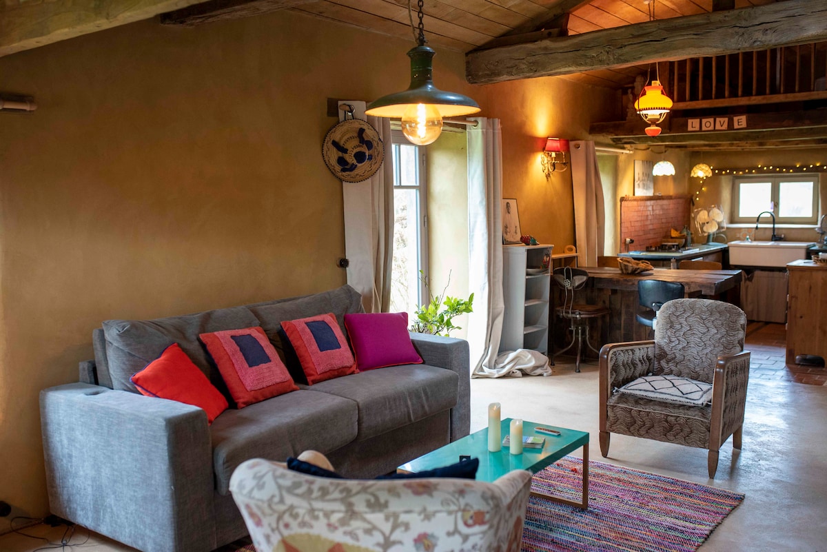 Détendez-vous dans ce logement calme et élégant et profitez de la nature environnante. Gite individuel, cuisine, salon, salle de bain et chambre avec lit double. Logement typique de la région. Sur un terrain de 2 hectares arboré, on profite pleinement du calme et de la nature. Nous sommes tout deux issu de la restauration et sauront vous accueillir avec soins. C'est la campagne verdoyante qui sera votre environnement. Les ballades sont nombreuses et les centres d’intérêts proches en voiture.