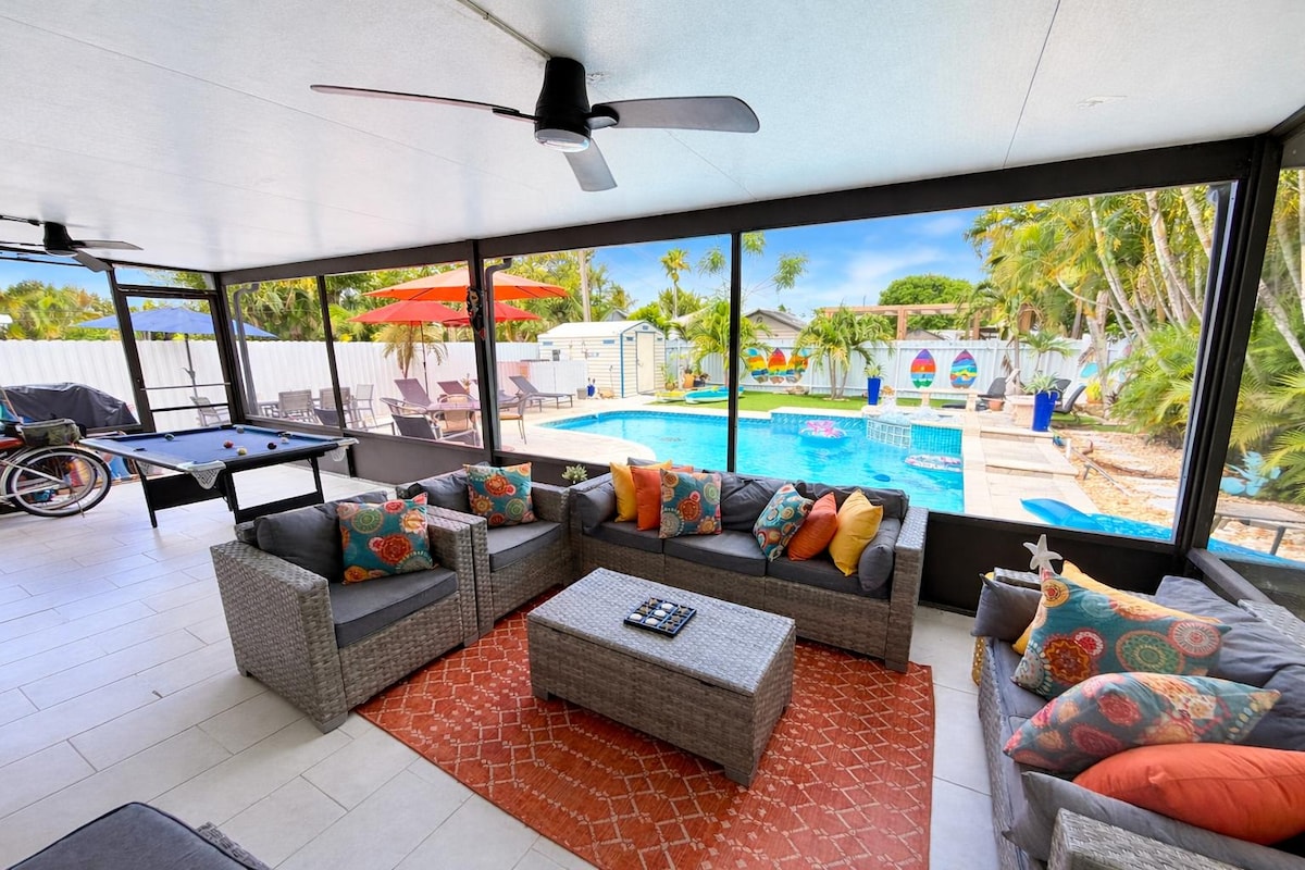 Mermaids’ Cove offers the perfect blend of sun, salt, and laid-back fun. Just 1 mile from the beach, close enough for an easy bike ride. Think sandy feet, rolling waves, glowing sunsets, and warm nights. Back home, your private palm-lined backyard lets the world slow down: float in the heated pool, soak in the hot tub or gather around the firepit for stories and drinks ay sunset. The Florida Room is made for downtime, with a TV, fridge bar, and pool table. Bikes and kayaks for fun outings