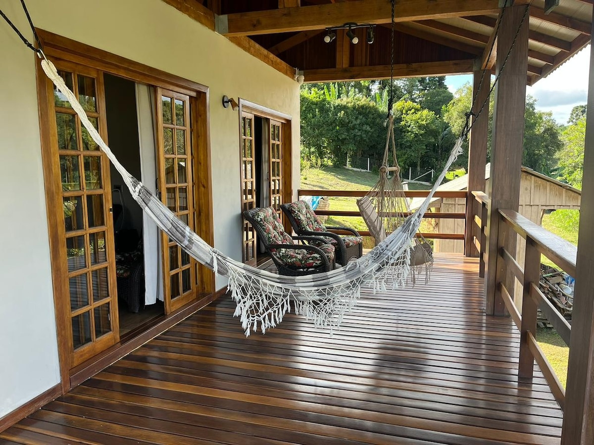 Um refúgio encantador em meio à natureza, ideal para quem busca tranquilidade, conforto e momentos especiais. Acomoda até 8 pessoas com muito aconchego. A casa tem cozinha planejada, fogão a lenha e um clima rústico acolhedor. Do lado de fora, quiosque com churrasqueira, mesa e piscina. Um lugar silencioso, seguro e rodeado de verde. Perfeito para relaxar, se reconectar e viver dias inesquecíveis com quem você ama.
