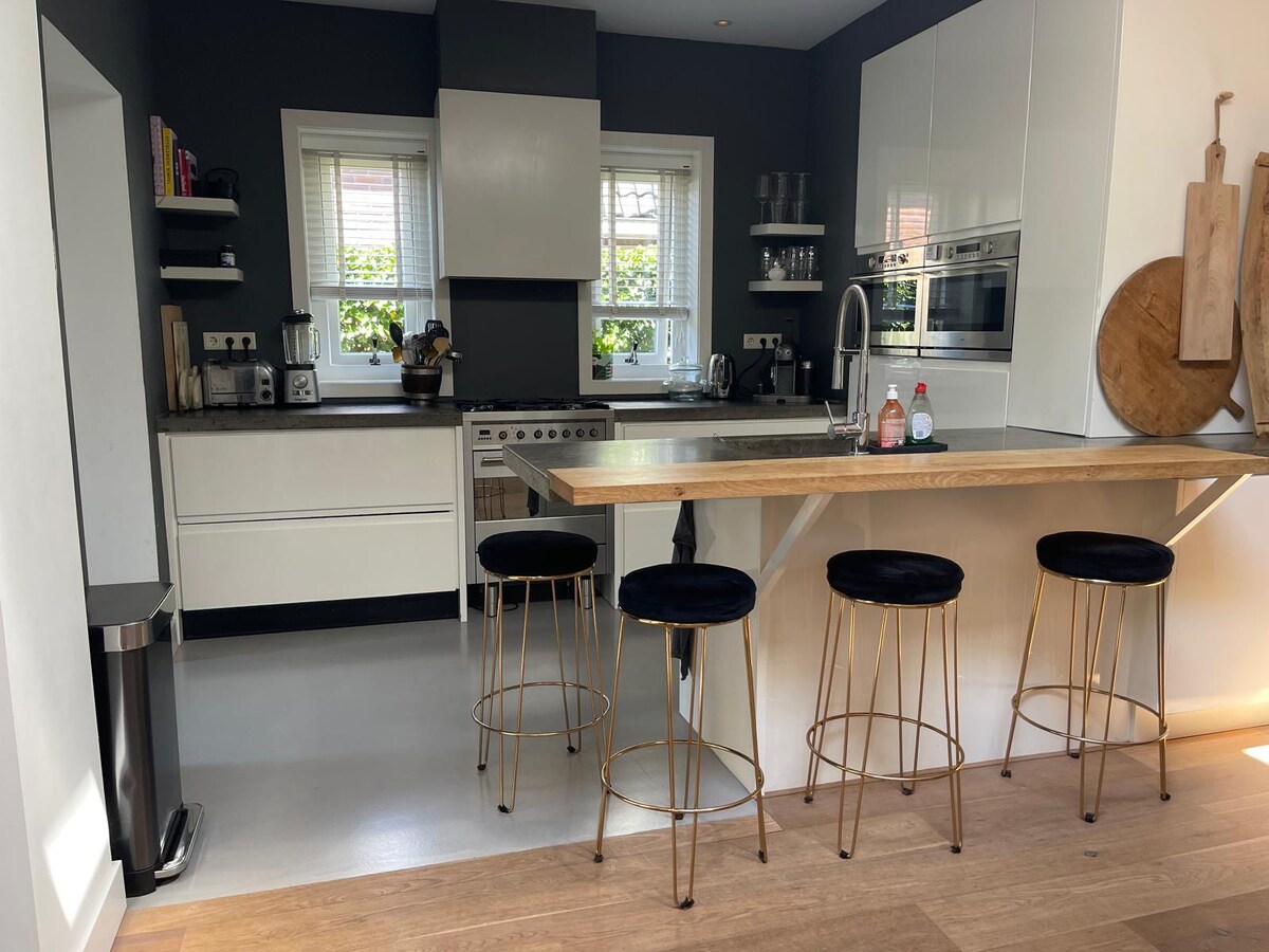 Nuestra cálida y acogedora casa adosada tiene una entrada, un hermoso jardín y está cerca del Hilversum 'heide.' En el interior, la cocina y el baño modernos complementan un interior elegante y tranquilo. El salón ofrece un ambiente relajado de salón con cómodos asientos y una estufa de leña, mientras que el comedor es acogedor con pieles de oveja Texel y una pared de lana colgada. El baño cuenta con una bañera independiente y una oficina en casa separada que ofrece un refugio tranquilo. Nuestro santuario cuidadosamente diseñado es céntrico y está amueblado con buen gusto.