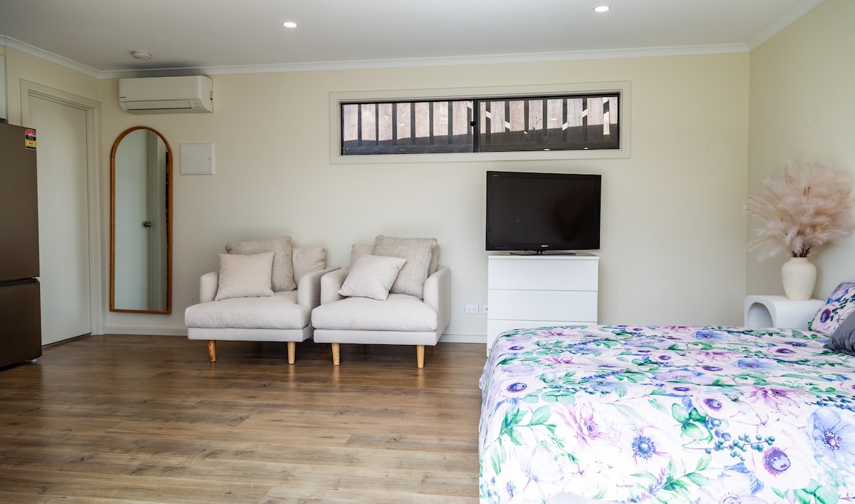 "The Haven" is a fully self-contained, independent flat. It boasts a brand new kitchen with electric cooktop and microwave/convection oven and brand new bathroom/laundry with toilet, shower and washing machine (2019). It is best suited to singles or couples. Maximum two adults. Can accommodate young babies. Reverse cycle AC ensures your stay will be a cosy one whatever the weather. Access is available to a sparkling in-ground swimming pool, surrounding entertainment area and BBQ.
