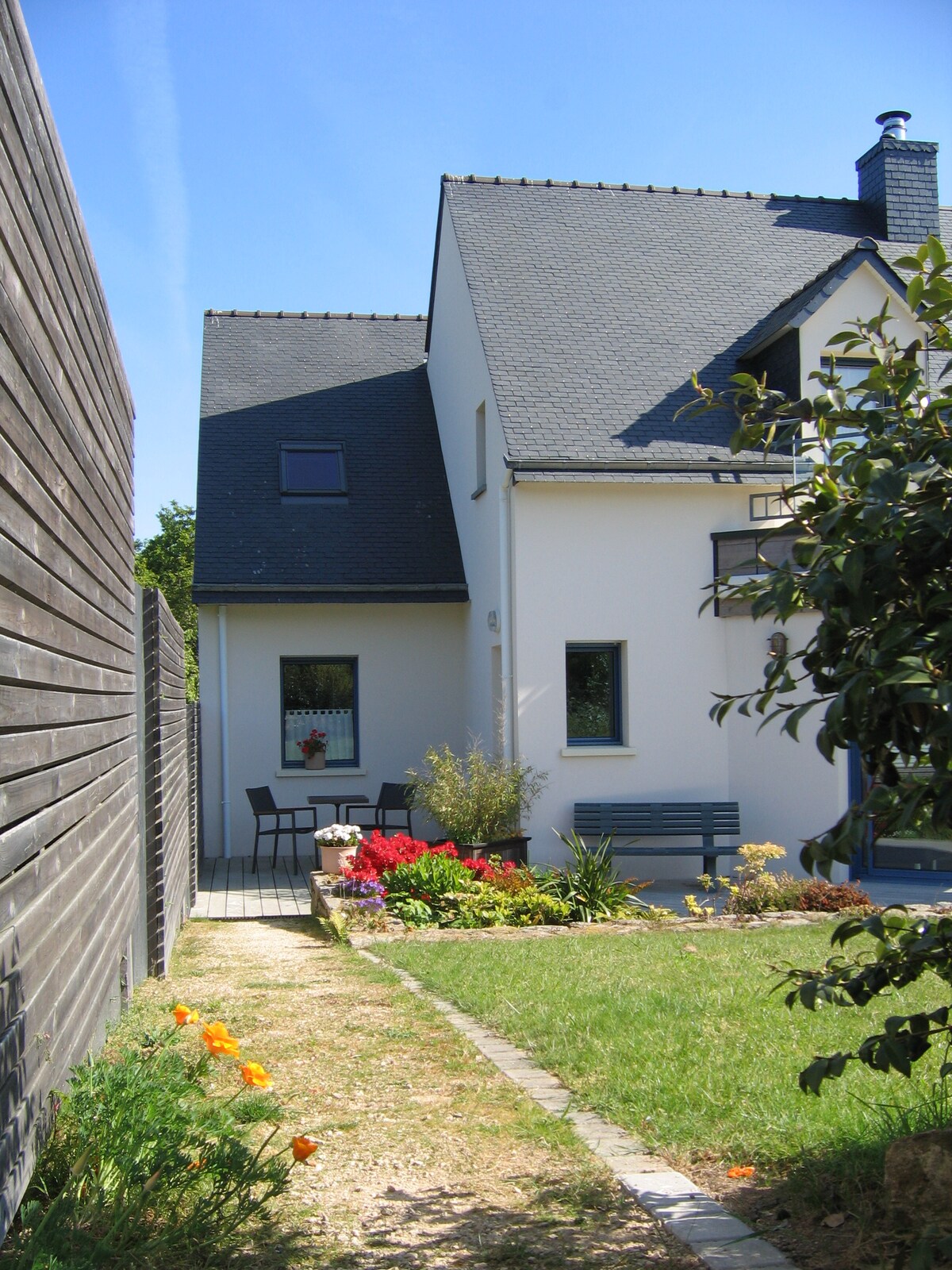Appartement t2 de 43 m² indépendant d' une maison individuelle exposition Sud, 2 à 4 personnes. Au sein d' un magnifique village Breton de bord de mer, 5 minutes à pieds de la plage et du bourg. Situé au calme dans un écrin de verdure, jardin paysagé et clôturé d'un muret typique de pierres sèches.
