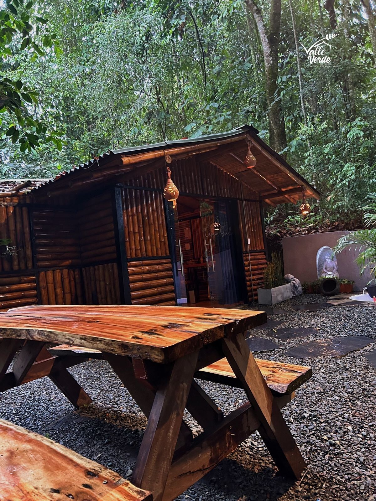 cabaña construida completamente en guadua, las lamparas son hechas a mano por artesanos de la region se encuentra ubicada dentro de un bosque virgen en donde podras apreciar la naturaleza la hermosa vista las diferentes variedades de arboles y podras hacer avistamiento de aves disfrutar de toda la fauna y la flora existe, conocer uno de nuestros 3 nacimientos de agua y hasta bañarte en él. estamos en el centro de una hacienda dedicada a la producción de leche, donde puedes conocer mucho del tema