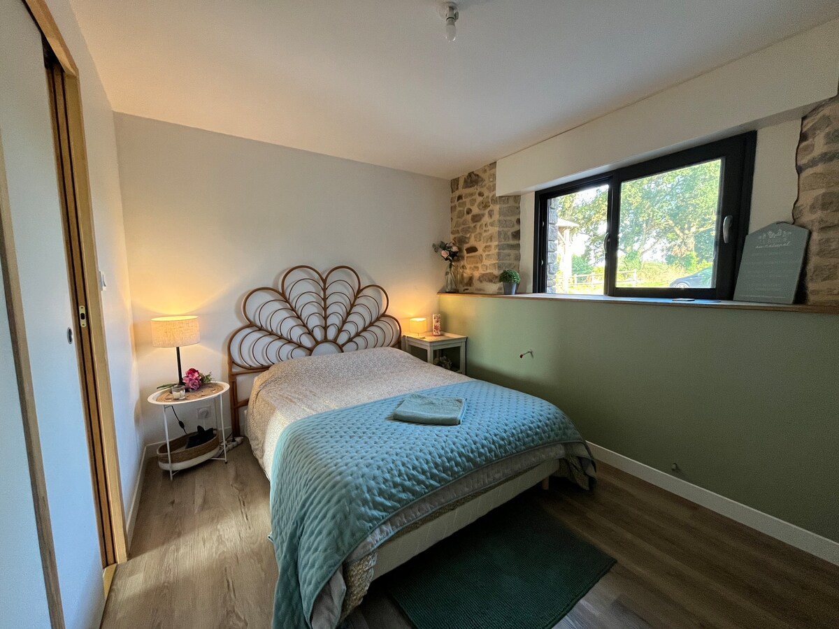 Habitación muy espaciosa totalmente redecorada por su propietaria. Allí encontrará una cama central de 140x190, un gran escritorio a la derecha con un gran velux con vistas al jardín y al valle verde. Una zona de estar con sillón y un hervidor de agua para disfrutar de té o café. Sin olvidar un vestidor, una entrada, biblioteca y un gran baño privado.