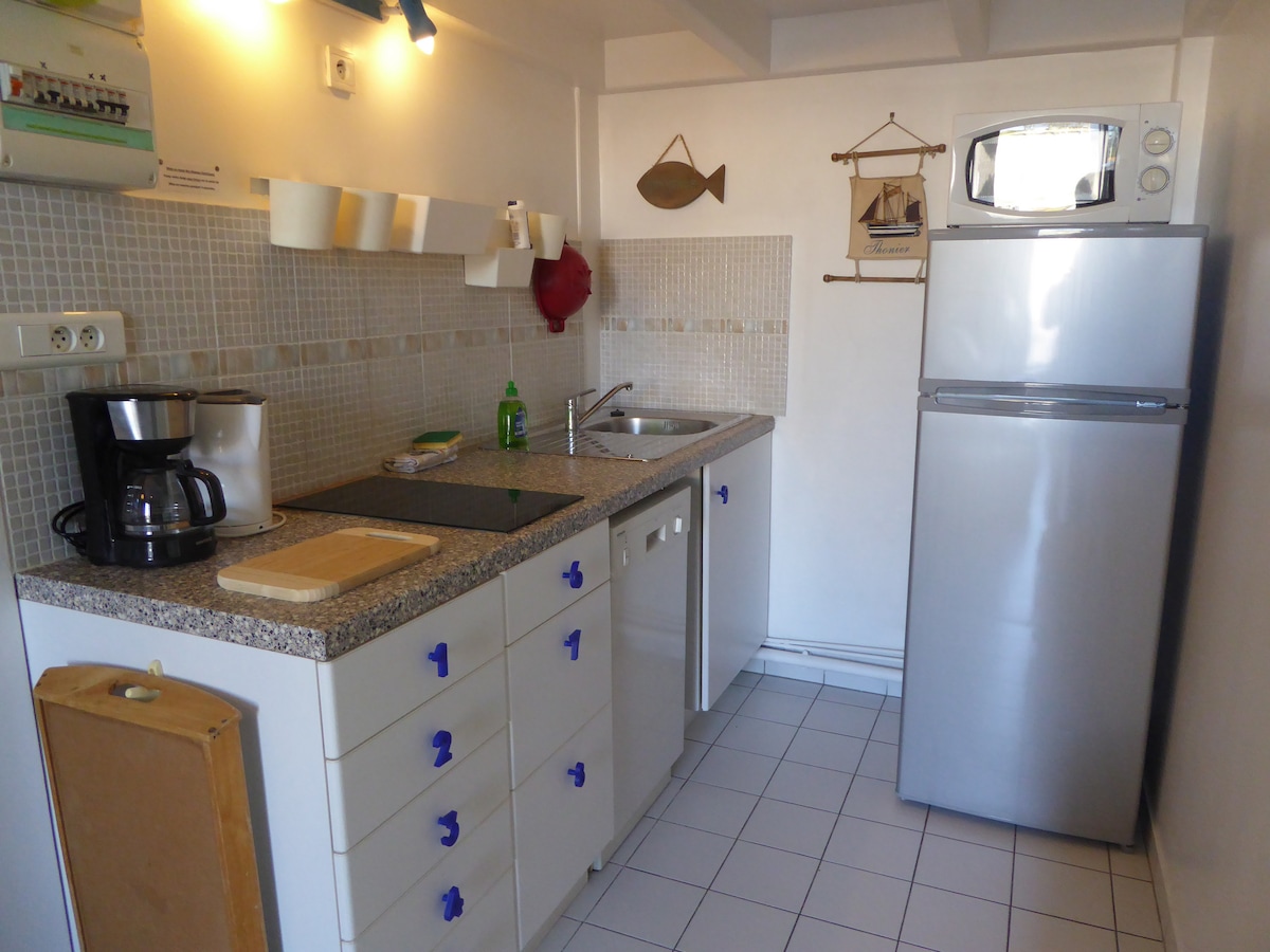 Estudio altillo de 25m2 con balcón con vistas al mar. Frente a la ciudadela de Vauban, se ve a lo lejos la isla de Houat. Apartamento clasificado 2 estrellas de Francia. tiene dos camas de 140 y 90, una cocina totalmente equipada, con lavavajillas, un baño equipado con una gran ducha, TV de pantalla plana y conexión wifi. Se proporcionan sábanas para su estancia. Situado a 50 metros del muelle de Le Palais, las casas del puerto son un punto de partida ideal para su ocio.
