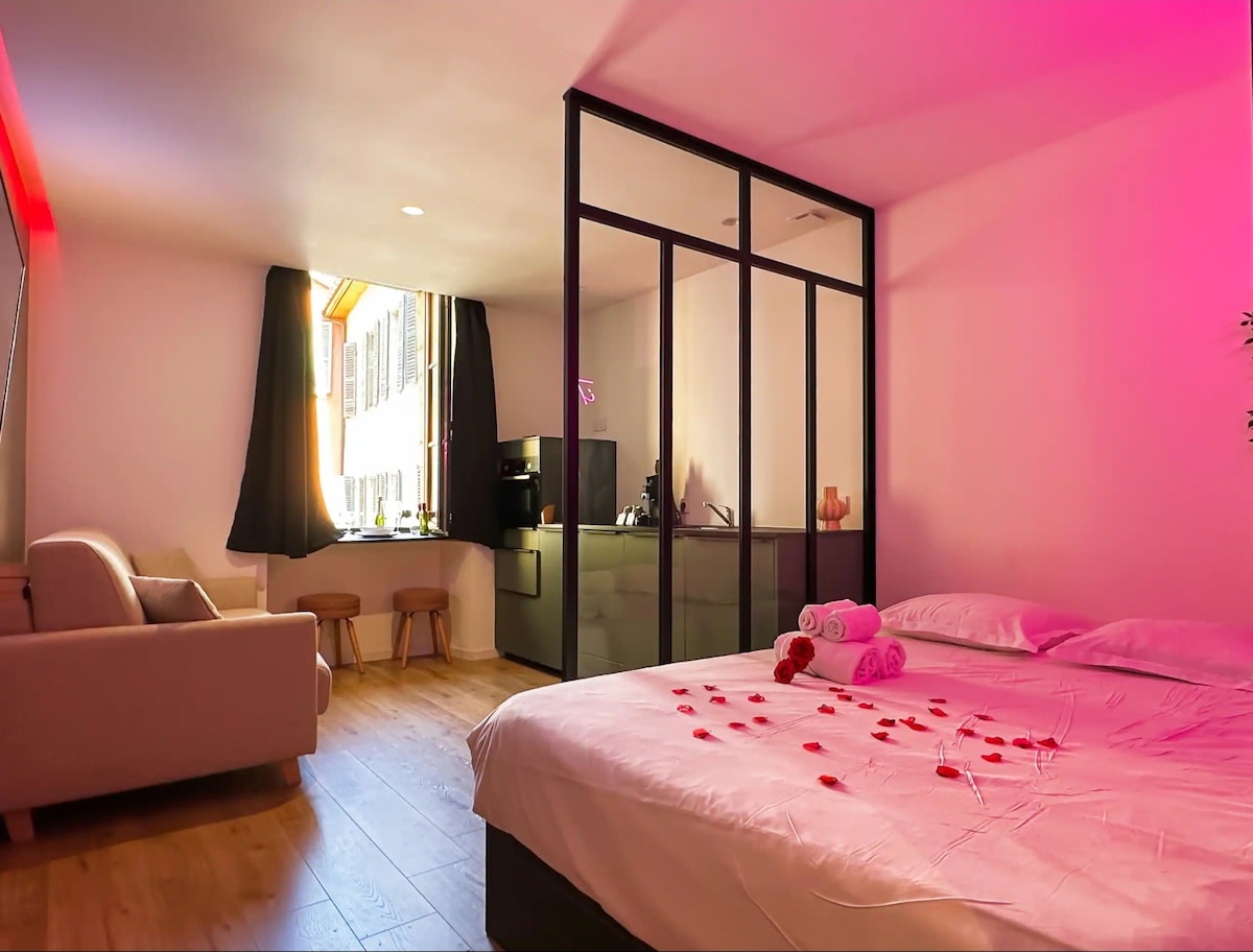 Al pie del castillo y en el corazón del casco antiguo de Annecy, un antiguo taller rehabilitado en espacio dedicado a la privacidad y la sensualidad. Completamente renovada con buen gusto, Love Room de 32 m2 especialmente pensado para parejas que buscan una escapada inolvidable a la Venecia de los Alpes. A 100 metros del Palacio de la Isla, a 300 metros del lago y del famoso Pont des Amours. Cerca de restaurantes y comercios. Ideal para visitar Annecy y acceder a pie a las principales atracciones turísticas de la ciudad.