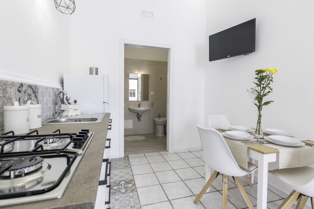 A tasteful apartment located in the heart of Lecce's historic center. The apartment is located on the first floor of a detached building and includes a spacious living room overlooking the characteristic Church of Santa Chiara, a double bedroom, two bathrooms, one with a shower, and a kitchen. Inside, you'll find all the comforts you need for a quality stay: heating, air conditioning, a washing machine, TV, and Wi-Fi.