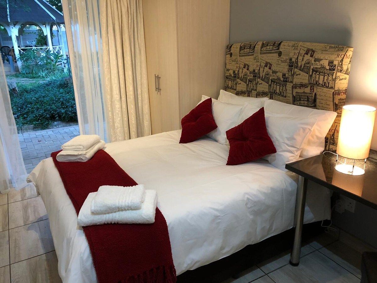 Unidad privada de 1 dormitorio ubicada en el centro con baño privado, cocina completa, área de trabajo designada y estacionamiento seguro detrás de una puerta de control remoto. El dormitorio cuenta con una cama tamaño king con ropa de cama de algodón egipcio blanco, un edredón de plumas de pato y un banquete eléctrico. Televisor de pantalla plana de 42 pulgadas tanto en el espacioso dormitorio como en el salón privado con paquete completo de DSTV. Los huéspedes también podrán acceder al wifi gratuito sin tapa. El acceso a la unidad se realiza a través de un área privada de “stoep”.