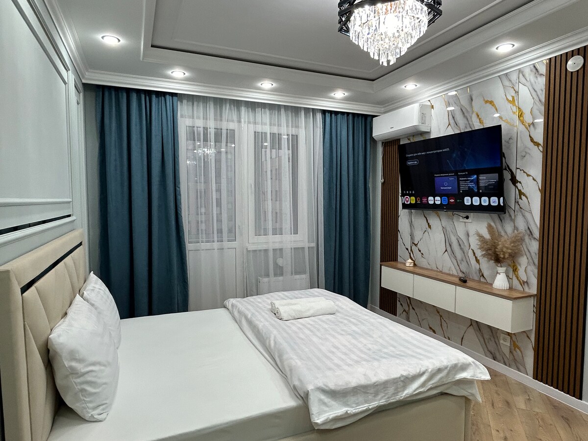 Bienvenido al apartamento de élite ubicado en el complejo residencial Al-Farabi cerca de la plaza. El apartamento está recién reformado con todos los elementos básicos necesarios para una estancia larga y cómoda para una estancia larga y cómoda: todos los electrodomésticos, internet wifi de alta velocidad, TV por cable, plazas para dormir 2, también hay un sofá plegable de 2 camas para los huéspedes, todos los muebles necesarios, platos para cocinar y comer.