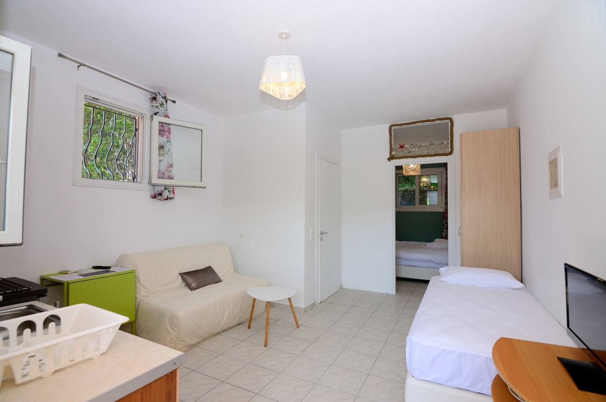 El estudio está situado en la primera planta en una de las zonas más céntricas de la ciudad. Está a 30 m de la estación de taxis y del aparcamiento público del centro de Parga y a 200 m, sin colinas, del puerto. Tiene aire acondicionado, wifi y TV de 40''. También hay aparcamiento privado gratuito para motocicletas. El sofá se convierte en una cama para una tercera persona (longitud: 1,67 m).