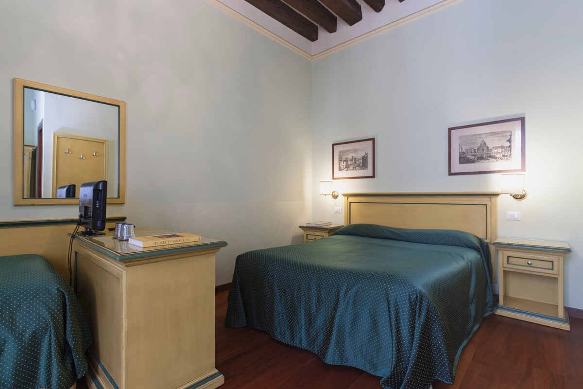 Hermoso dormitorio, con baño privado y entrada privada con puerta blindada. A menos de 5 minutos a pie de Piazzale Roma o de la estación. Se encuentra en la 2ª planta del edificio, tiene techos altos con vigas a la vista y suelos de madera. Los sistemas y el mobiliario son nuevos, cómodos y modernos. La habitación, luminosa y espaciosa, da a un típico patio veneciano. Desde 1570 hasta hoy, todos los domingos por la mañana a las 10:30, se escuchan canciones gregorianas en vivo y se llega incienso al interior de la casa. Sin aire acondicionado.
