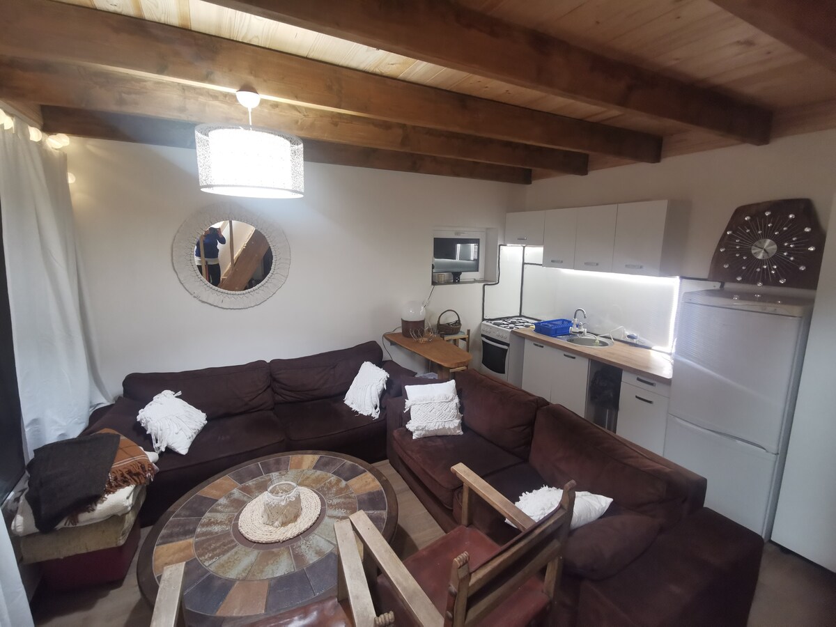 Una hermosa vista de nuestros campos cálidos y un estanque lleno de peces es inolvidable y encantadora. Nuestra nueva casa de madera no es grande, pero es muy acogedora . Consta de una sala de estar con cocina y baño de 35 m2, un loft de dos dormitorios debajo de las pistas (bajas). Patio con bancos y mesa. Un banquete independiente con bancos y una mesa. Barbacoa y brasero . Parque infantil . Sauna y jacuzzi al aire libre. Manak. Estacionamiento .