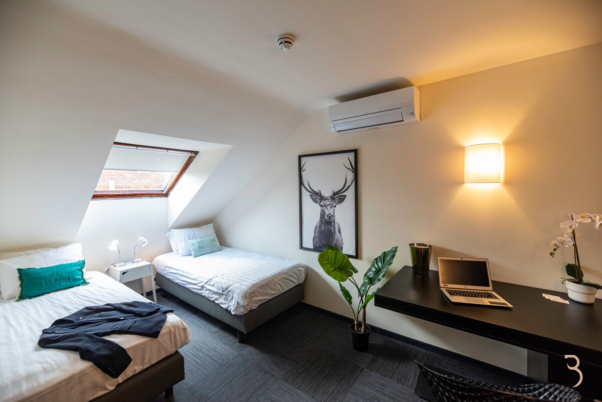 A double room with two separate beds and private bathroom with shower. The room is equipped with sheets, towels, soap, TV, coffee, tea and water. Surface : 15m2 – 2 persons Private bathroom with shower and toilet 2 single beds 90cmx2m00 Towels and bed linen Hairdryer Proximus TV Wifi free Breakfast included Check-in from 16:00h/check out till 11:00h Bike wash and bike parking