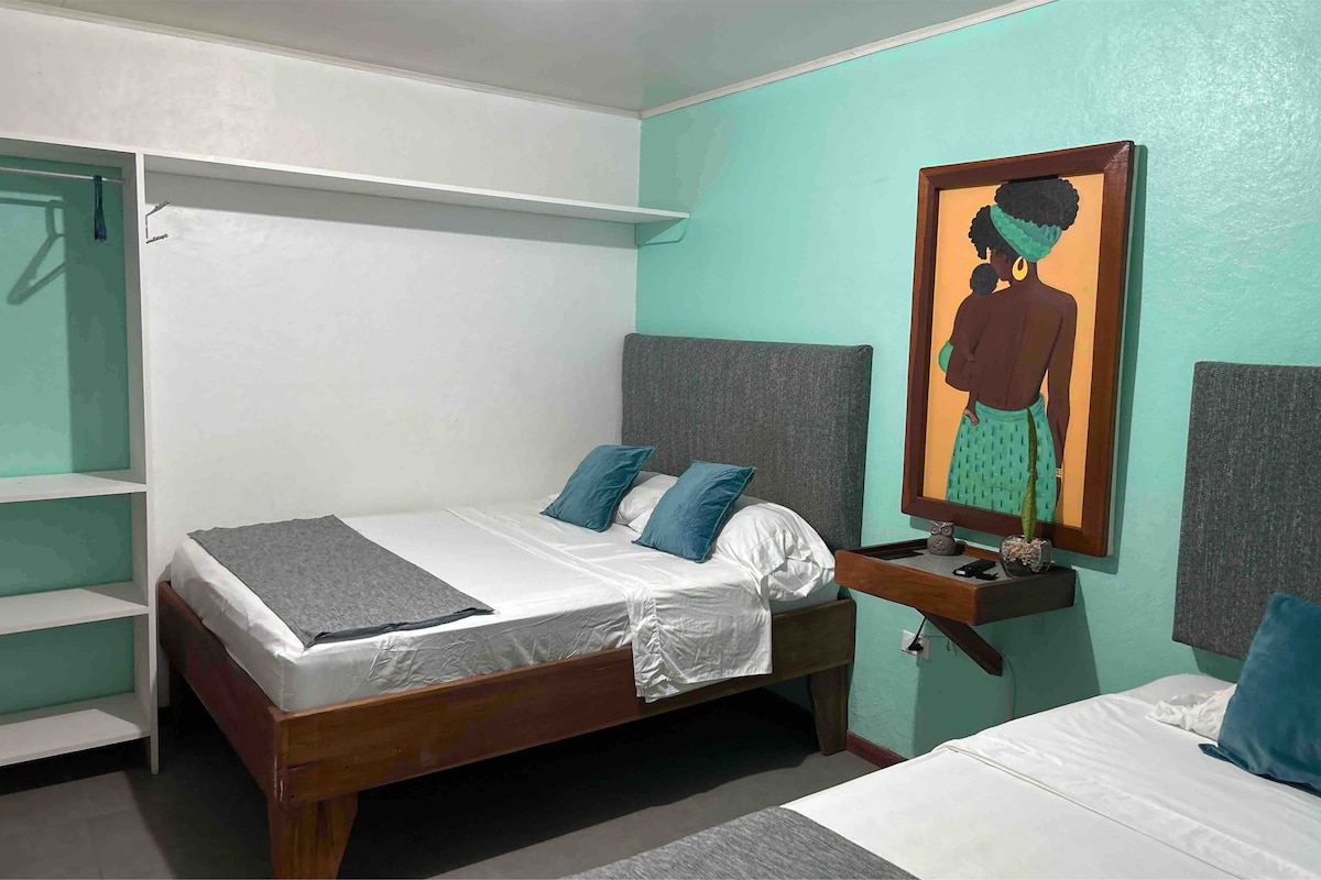 Charming boutique, adult-only hotel with three rooms, one 1-bedroom casita, and one 2-bedroom casa.* This room includes a private bathroom, full size bed, AC, hot water, bidet,linen, fan, closet and desk. Amenities: Pool, bar, Lounge, games, Outdoor shower, bikes, Shared kitchen, Bikes, WiFi, Gardens , limited Secured parking - (please request), Laundry, Barbecue/firepit. Just a 5-minute walk to the beach and a 15-minute walk to Puerto Viejo center. *Click host details for more info.
