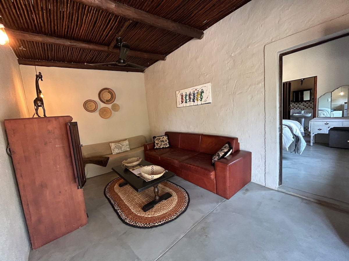 Bush Lodge 2 .A comfortable quaint lodge with a double bed ,fresh clean linen en-suite bathroom. The lounge area ,has a single sofa bed for an extra guest. A flat screen with full DSTV, Netflix and WIFI.A fully equipped kitchenette . An outside open air covered seated area with barbeque/braai facilities. The lodge has lovely views of the bushveld surrounds. Use of communal pool on riverbed
