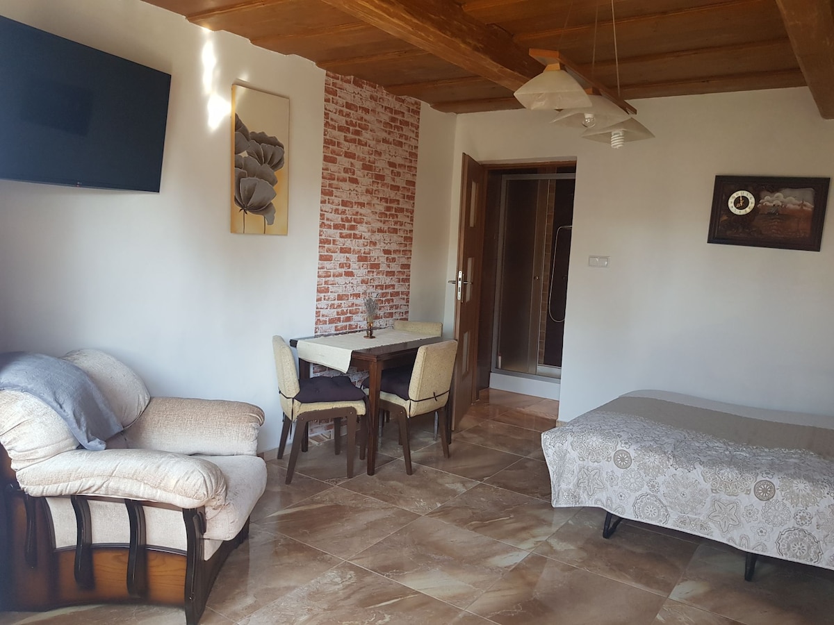 Una acogedora casa privada construida junto a nuestra propia casa en Rabcice, que está rodeada de bosques con múltiples puntos de referencia a poca distancia en coche. Nuestra pequeña casa de campo ofrece una sauna completa en funcionamiento, baño con ducha e inodoro, wifi gratuito, un cine en casa para ver películas junto a la chimenea y una cocina completa con los servicios esenciales. Ofrecemos una parrilla para usar al aire libre. Posibilidad de utilizar el jacuzzi por un suplemento. Tus mascotas son bienvenidas en nuestro alojamiento con una tarifa de limpieza adicional.