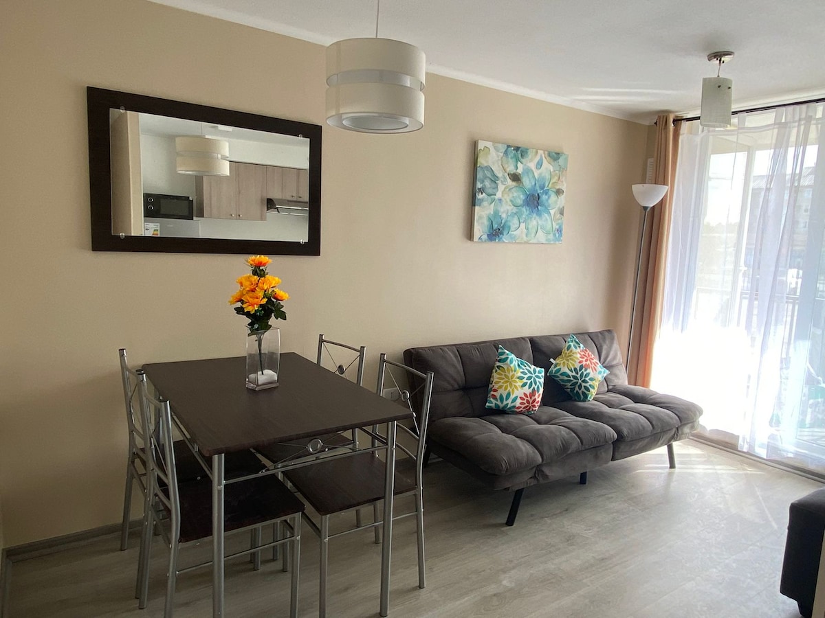Disfruta de una estadía cómoda y relajante en este luminoso y amplio departamento, con acceso directo a los principales puntos turísticos de la región Capacidad para 4 personas: Cuenta con 1 cama matrimonial y 2 camas individuales, una cocina completamente equipada, toallas y sábanas hoteleras, cortinas blackout, secador de pelo y todo lo necesario para que te sientas como en casa. ☕ Además, incluye wifi, app zapping tv, estacionamiento privado y café Nespresso de cortesía.