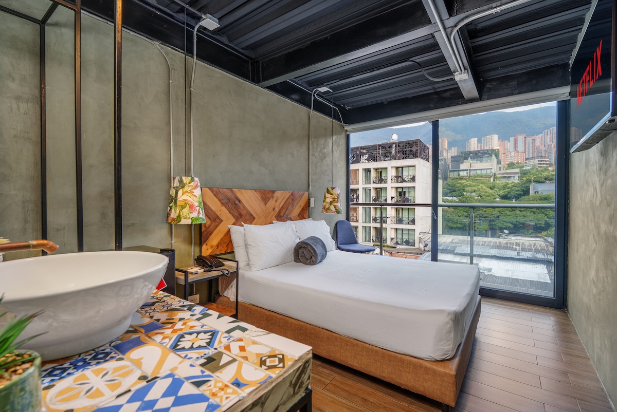 Este aparta estudio de diseño industrial ofrece confort, estilo y ubicación privilegiada en una calle tranquila de la mejor zona de Medellín. Perfecto para una o dos personas, cuenta con cama King, jacuzzi para dos, balcón, aire acondicionado, cocina equipada, WIFI de 160 MB y TV de 55" con streaming. A pocos minutos de zonas vibrantes, rodeado de restaurantes, tiendas y supermercados. Ideal para disfrutar la ciudad como un local, con tranquilidad y estilo. 3er piso con ascensor.