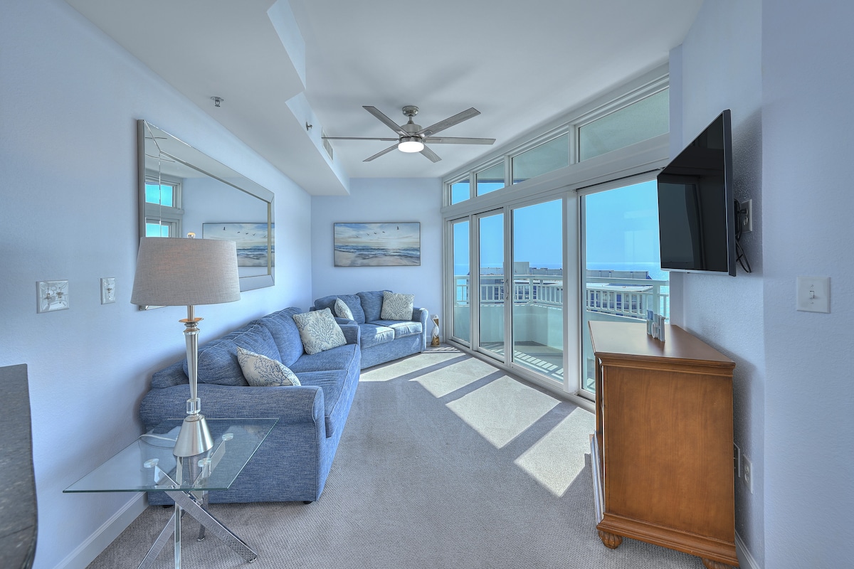 Disfruta de impresionantes vistas al mar y al atardecer desde nuestro condominio súper limpio de 5 estrellas en el 8vo piso. "OCEAN BLUE" es un espacioso diseño de 1 dormitorio con una cama tamaño king, cocina completa, balcón grande, televisores inteligentes y chimenea. Ubicado en una prestigiosa zona de Myrtle Beach conocida como la Milla de Oro, a pocos minutos de restaurantes, tiendas y atracciones. ¡Reserva ahora la mejor escapada MB! Lavadora/secadora ubicada dentro del condominio. Este apartamento también está disponible para alquiler de invierno a largo plazo.