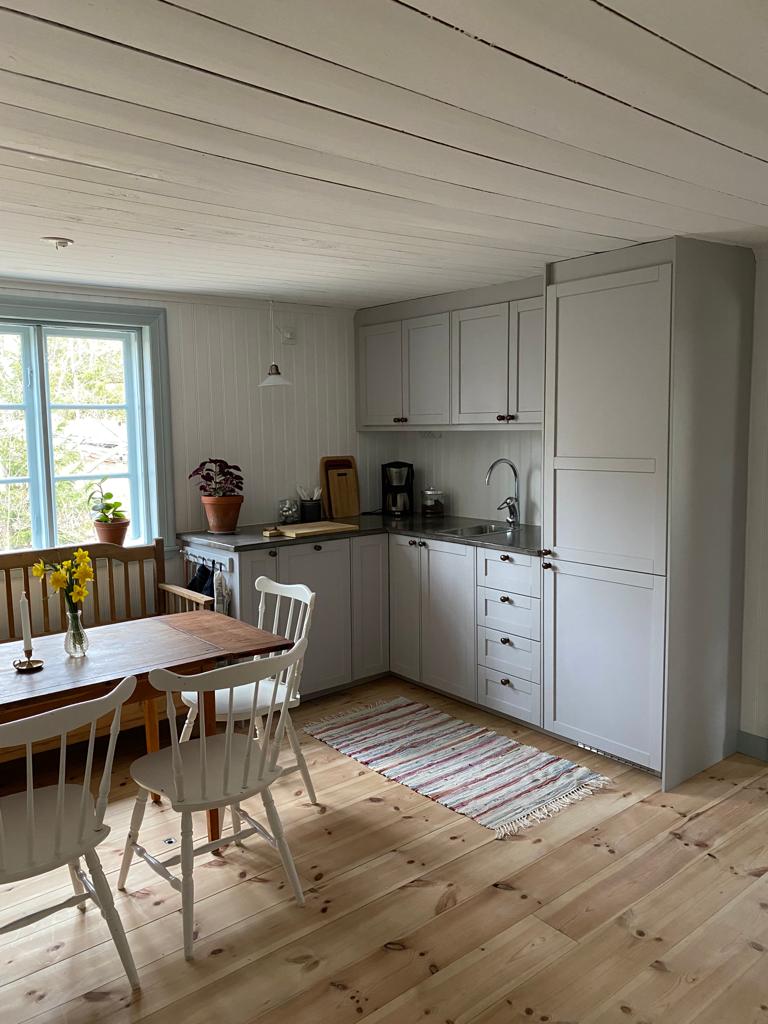 Historia: Nuestra granja fue construida a principios del siglo XX por el antiguo abuelo de Caroline, Erik. Nuestra casa se construyó en 1908, y el resto de los edificios en los años siguientes. En 1925, la pequeña cabaña se utilizó como una pequeña casa de granjero, mientras que el piso de arriba y la parte donde ahora está la cocina eran almacenes y graneros. A principios de la década de 1980, fue convertida en vivienda por el abuelo de Caroline, Nils. Disfruta de un gran jardín, una acogedora cabaña a solo 80 metros de la orilla del mar.