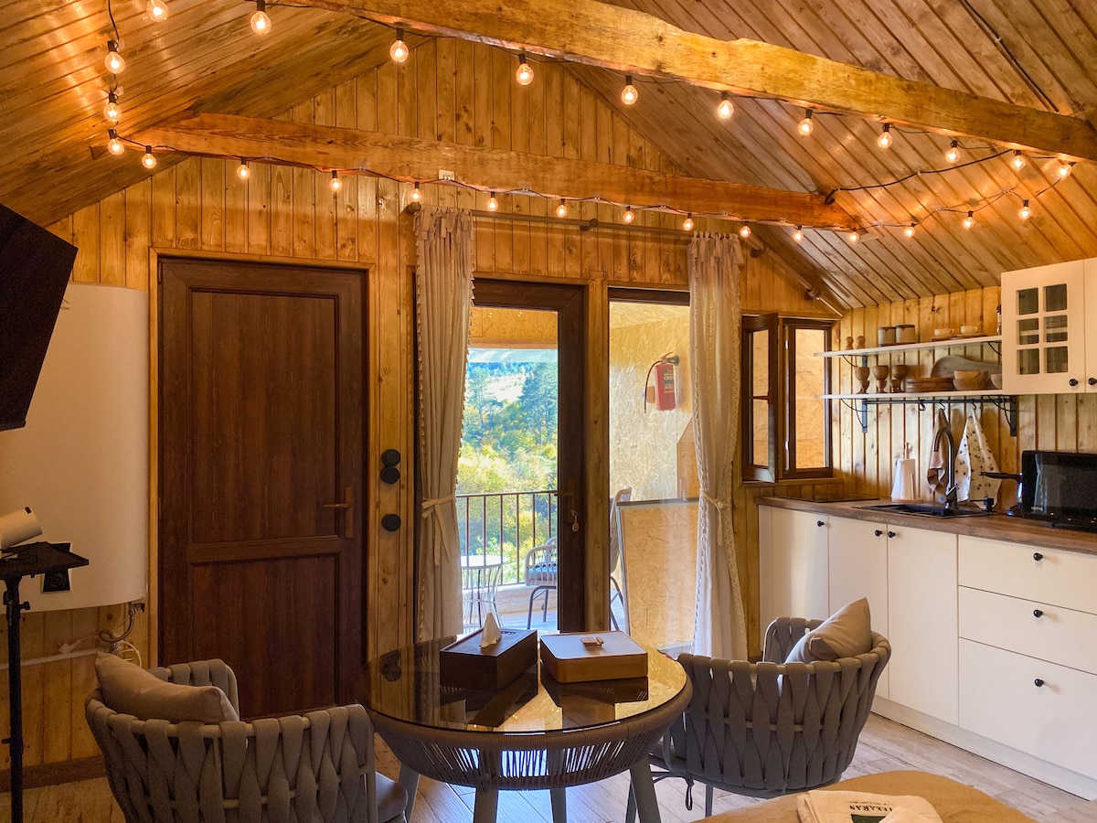 Cozy rooftop wooden studio for two at Tesaran Stepanavan Guest House in Armenia. The apartment includes a fully equipped kitchen, open balcony with stunning mountain views, a modern bathroom, and a private hot-jacuzzi room facing the same beautiful scenery. Inside, enjoy an electric fireplace and projector for movie nights. Guests also have access to shared patios, BBQ area, hammock, garden space, and free parking—perfect for a peaceful nature escape.