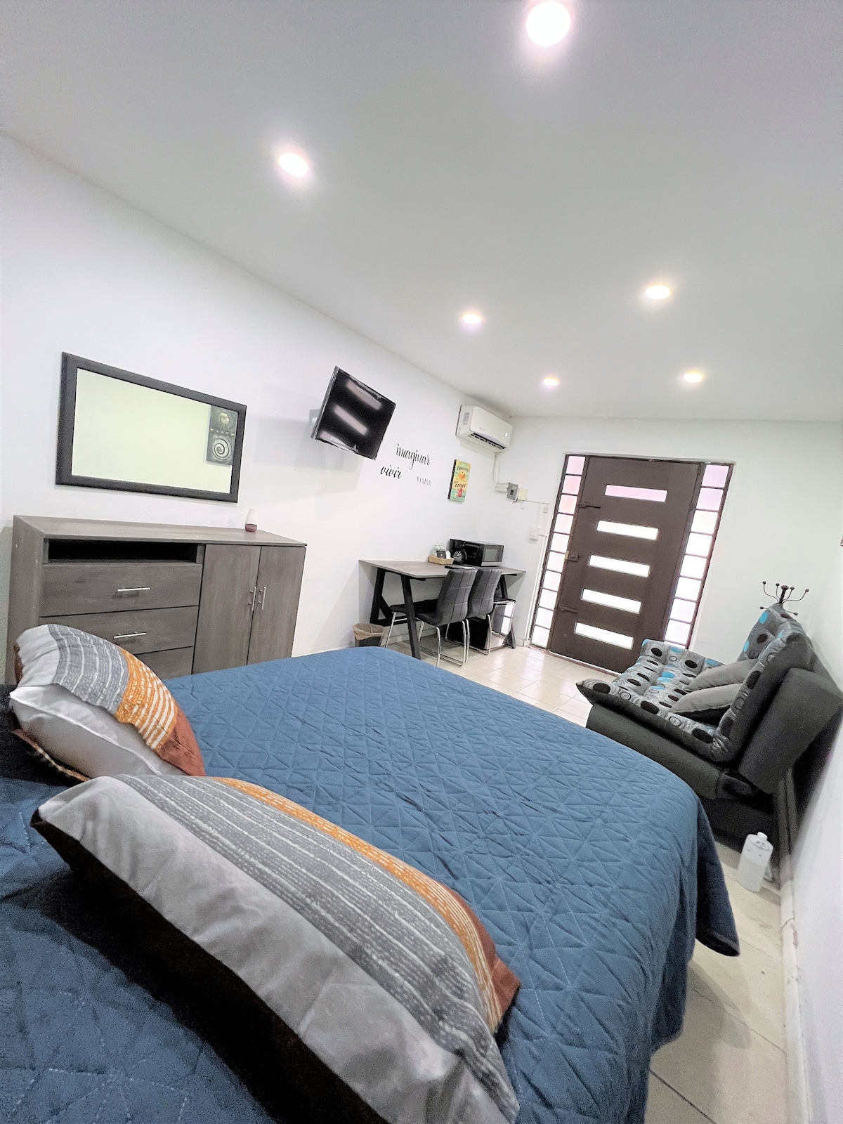 Disfruta de la sencillez de este alojamiento acogedor y céntrico, a tan solo 7 cuadras de la Linea 3 del trén ligero. Perfecto para largas y cortas estancias, con una relajante terraza privada al aire libre, cocina completa, microondas, comedor para cuatro personas, sofá convertible a cama, aire acondicionado y agua caliente. Adicionalmente se cuenta con estacionamiento gratis fuera de la propiedad, plancha y tabla para planchar. Recomendado para dos personas, apto para hasta cuatro.