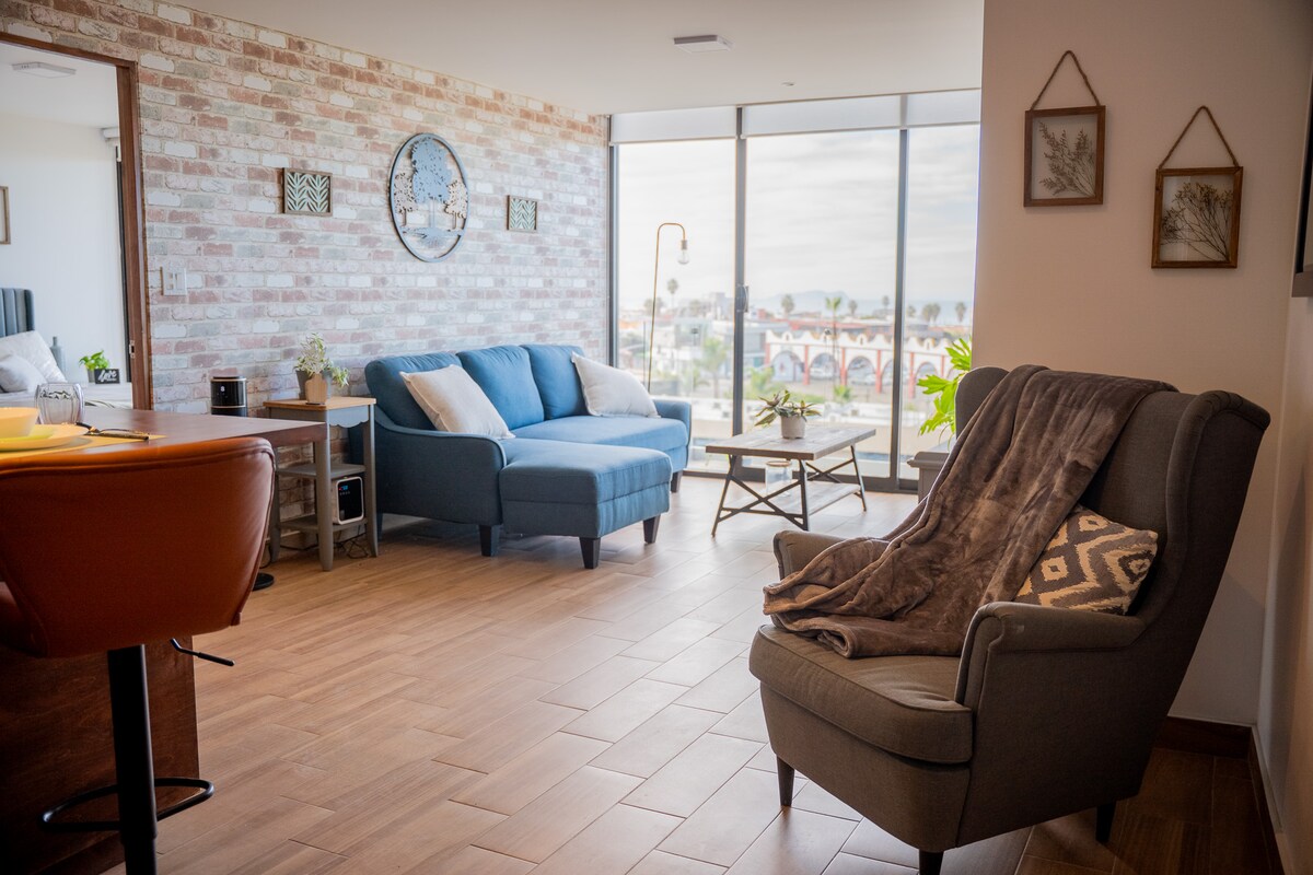 Disfruta la comodidad de este alojamiento Nuevo, tranquilo y muy céntrico. Estupenda vista y magnifica ubicación a solo 5 minutos de la frontera México-USA. A tan solo unas calles de la vibrante Av.Revolución. A pocos pasos de restaurantes, vida nocturna y consultorios médicos. Cuenta con 1 recámara (1 cama Queen + colchón inflable), 1 Tv 50” con aplicaciones: HBO, Netflix, MLB. Utensilios de cocina, lavadora, secadora y plancha para ropa, secadora de cabello. Parking gratuito con seguridad 24/7