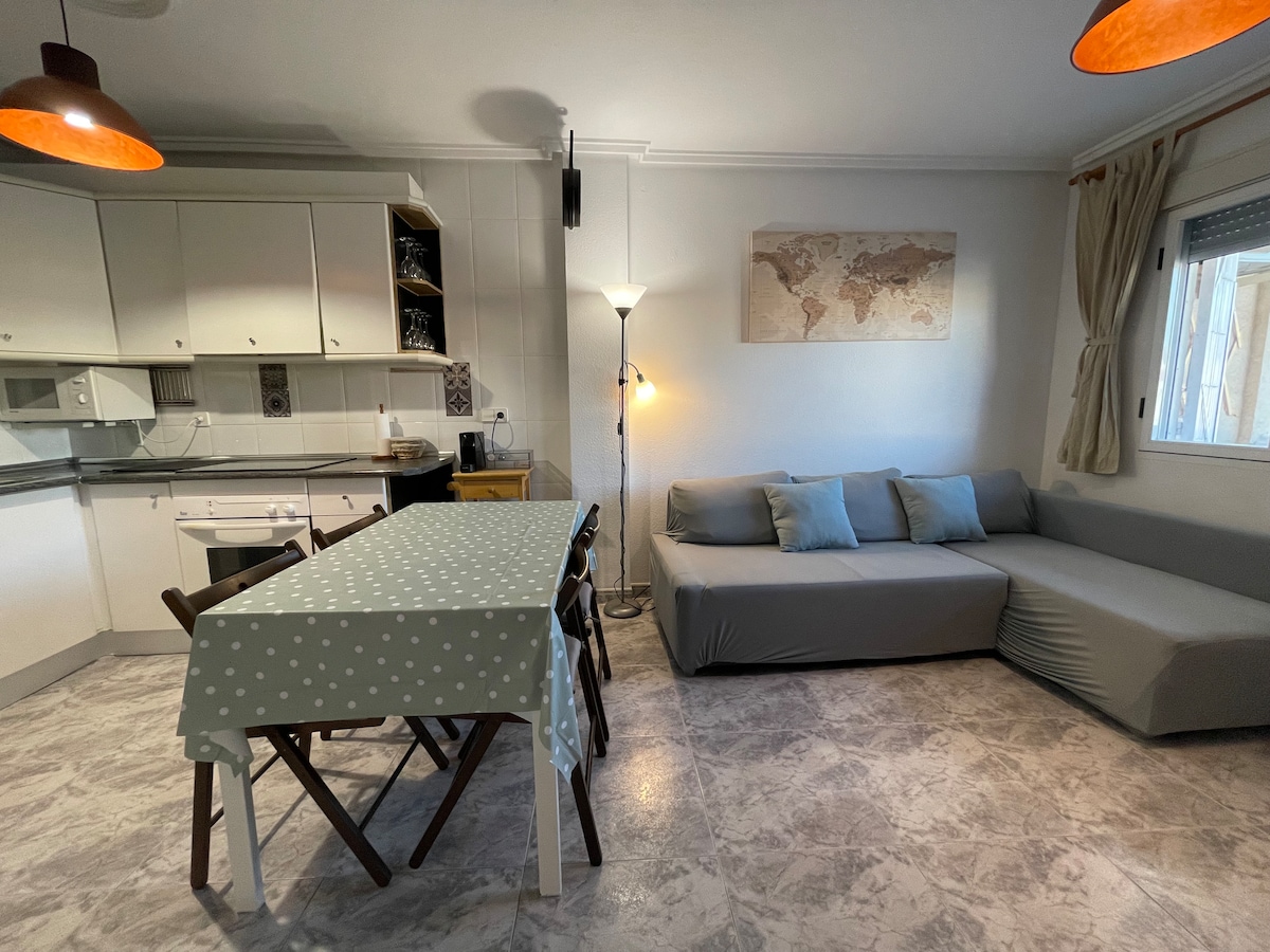 Apartamento a una calle de la playa, zona Tamarit habilitada para 4 personas. Segundo piso sin ascensor, terraza con vistas laterales al mar, cocina americana, salón - comedor con sofá cama, habitación principal con cama de matrimonio y habitación con 2 camas pequeñas, baño completo con ducha, galería con lavadora, plaza de parking para 1 coche. Internet fibra 1 Gb. Aire acondicionado en el salón comedor y habitaciones. Cerca del parque natural de las Salinas de Santa Pola y playa la Gola.