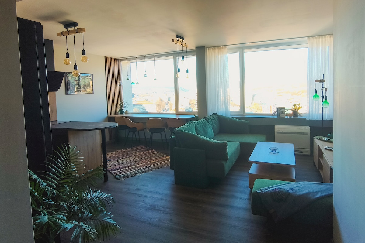 Bienvenido a Viora, un apartamento recién renovado y elegante ideal para familias o grupos. La propiedad ofrece dos acogedores dormitorios, una cocina totalmente equipada, un baño estilo spa y una amplia sala de estar con un sofá cama e impresionantes vistas panorámicas. Wifi rápido, televisor inteligente y decoración elegante crean el lugar perfecto para una estadía relajante. Ubicado a 2,4 km del centro de la ciudad, cerca de tiendas, restaurantes y atracciones. Ambos balcones tienen áreas para fumadores.