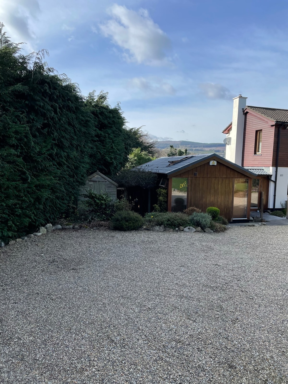 Grande, moderno, rural, cómodo, tranquilo, lleno de luz, con un pequeño patio/jardín cerrado con comedor al aire libre, vistas panorámicas espectaculares a la montaña y al mar. Lo mejor de ambos mundos, ya que está a solo 5 minutos del pintoresco pueblo de Enniskerry, con sus pubs y cafés, y de los mundialmente famosos jardines, casa y cascada de Powerscourt. A 5 minutos de los tejedores de Avoca en Kilmacanogue. A 2 minutos de Djouce para pasear por el bosque, hacer senderismo en bicicleta, etc. A 10 minutos de la ciudad de Bray. A 30 minutos de la ciudad de Dublín. A 45 minutos del aeropuerto de Dublín.