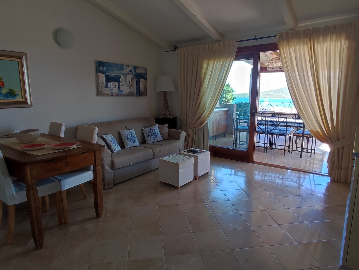 El apartamento consta de salón con vistas al mar, cocina americana con encimera de mármol para desayunar, baño con ducha y un gran dormitorio doble. Hay una gran terraza cubierta, con mesa y 2 sillones. Verás unas vistas únicas del fiordo y del archipiélago de La Maddalena. Aire acondicionado y ropa de cama bajo petición. Plaza de aparcamiento privada cubierta.