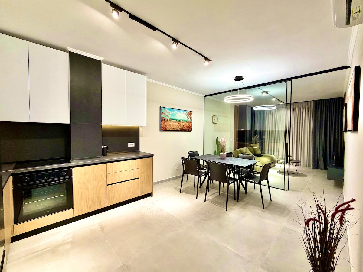 This Experience comfort and style at The Grand Stone Apartments Central Lushnje, a modern 2-bedroom suite in the heart of Lushnje. Perfect for business or leisure, the apartment offers elegant interiors, a fully equipped kitchen, and a relaxing lounge area. Located above the city’s vibrant The Grand Stone Bar, it’s the ideal base to explore Berat, Divjaka, and Ardenicë—all just a short drive away.