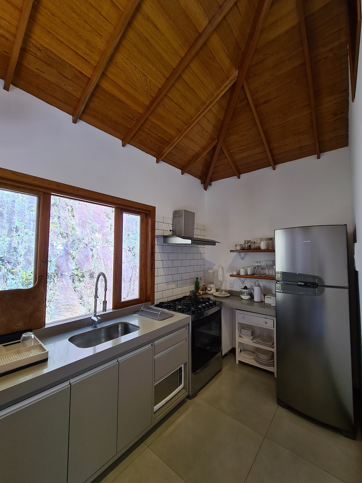 Semana Santa desconto de 20% para 3 diárias. O anúncio só se refere à casa no térreo. Sala de estar e de jantar, 2 quartos, sendo um suíte, banheiro social, cozinha completa, deck com churrasqueira, quiosque para refeições, ducha externa, toda em vidro, ao lado da floresta e do riacho. Pássaros, esquilos e micos. Paz e tranquilidade. A 1,5 km do centro de Lumiar. Acesso fácil. Rodovia Lumiar para Nova Friburgo. OBS: Permitido crianças só a partir de 12 anos.