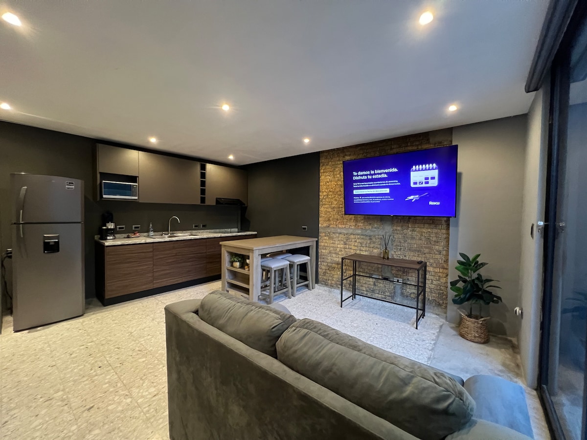 Visita increíble loft en el corazón de Monterrey con un diseño moderno y acogedor totalmente nuevo!Este espacio cuenta con cocina equipada,cómoda habitación con cama de lujo marca Lunna #1 de México,sala de estar,Smart TV con todas las apps de streaming,ubicación inmejorable a pasos de la Macroplaza,Barrio antiguo,Santa Lucía y otras atracciones locales.Transporte accesible para explorar la ciudad.Amenidades Increíbles como piscina, gimnasio,área de cine y zona de cowork oficina para trabajar.