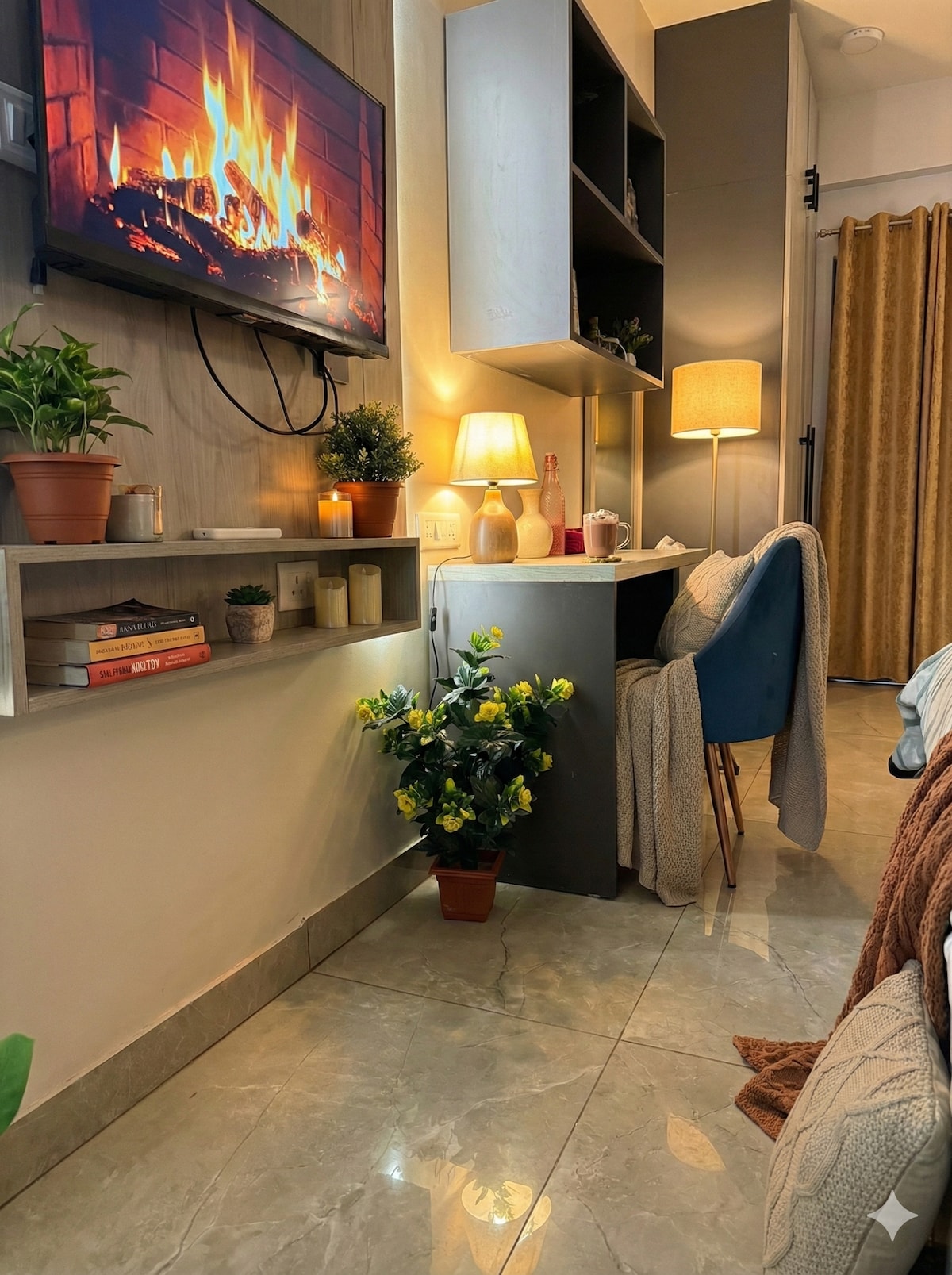 Luxe Spacious Studio by CASA NESTA at main mahal road • 43 inch Sony Smart TV with OTT subscriptions included • High-speed 100 MBPS WI-FI • Oil Heating • Toiletries • Includes COFFEE MACHINE, Toaster, cookware & utensils • Fridge, kettle, Microwave & all basic cooking essentials • Beautiful aesthetic mirror ideal for pictures and couple moments