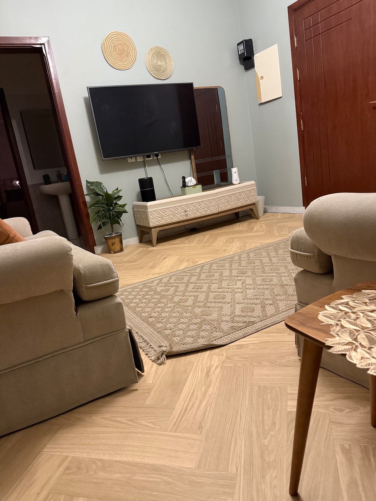 Apartamento tranquilo que consta de un dormitorio de lujo, una sala de estar, una cocina completa para cocinar sus comidas favoritas y un baño totalmente equipado - Está a 5 minutos en coche de la Mezquita del Profeta y a 3 minutos en coche de la Mezquita de Quba, y muy cerca de la Pasarela de Quba y la Mezquita de Jumma. 🕌 - Todos los servicios, restaurantes y tiendas están disponibles las 24 horas - Sofá para relajarse - Pantalla inteligente de 65 pulgadas conectada a wifi para que disfrutes viendo la televisión con la familia - La pantalla inteligente tiene todas las aplicaciones de Netflix y YouTube Bienvenidos a nuestra nueva residencia💜 Estamos a su disposición durante toda la estancia