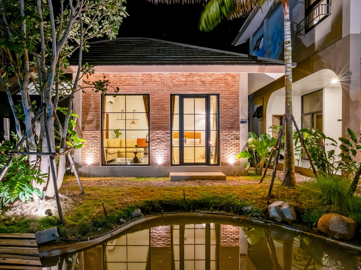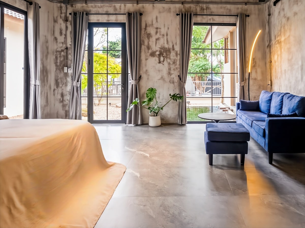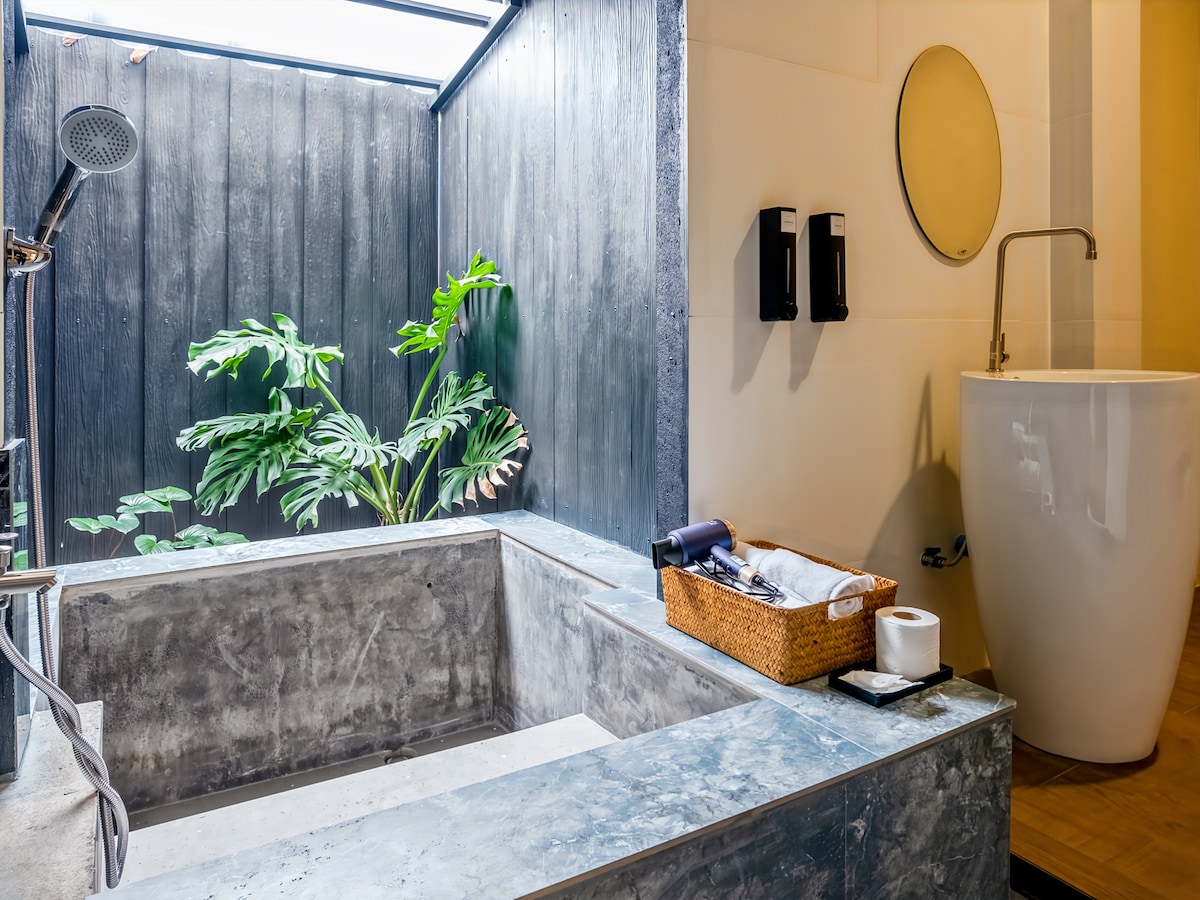 Bathe beneath the skylight — our signature concrete bathtub sits directly under an open skylight, so you soak in natural daylight or gaze at the stars after dark. This minimalist garden suite features a king bed, floor-to-ceiling windows overlooking serene gardens, and a workspace for digital nomads. The design is deliberately calm and uncluttered — a true zen escape in Pai's only design boutique hotel. Gardens, koi ponds, and Pai Night Market all within easy reach.