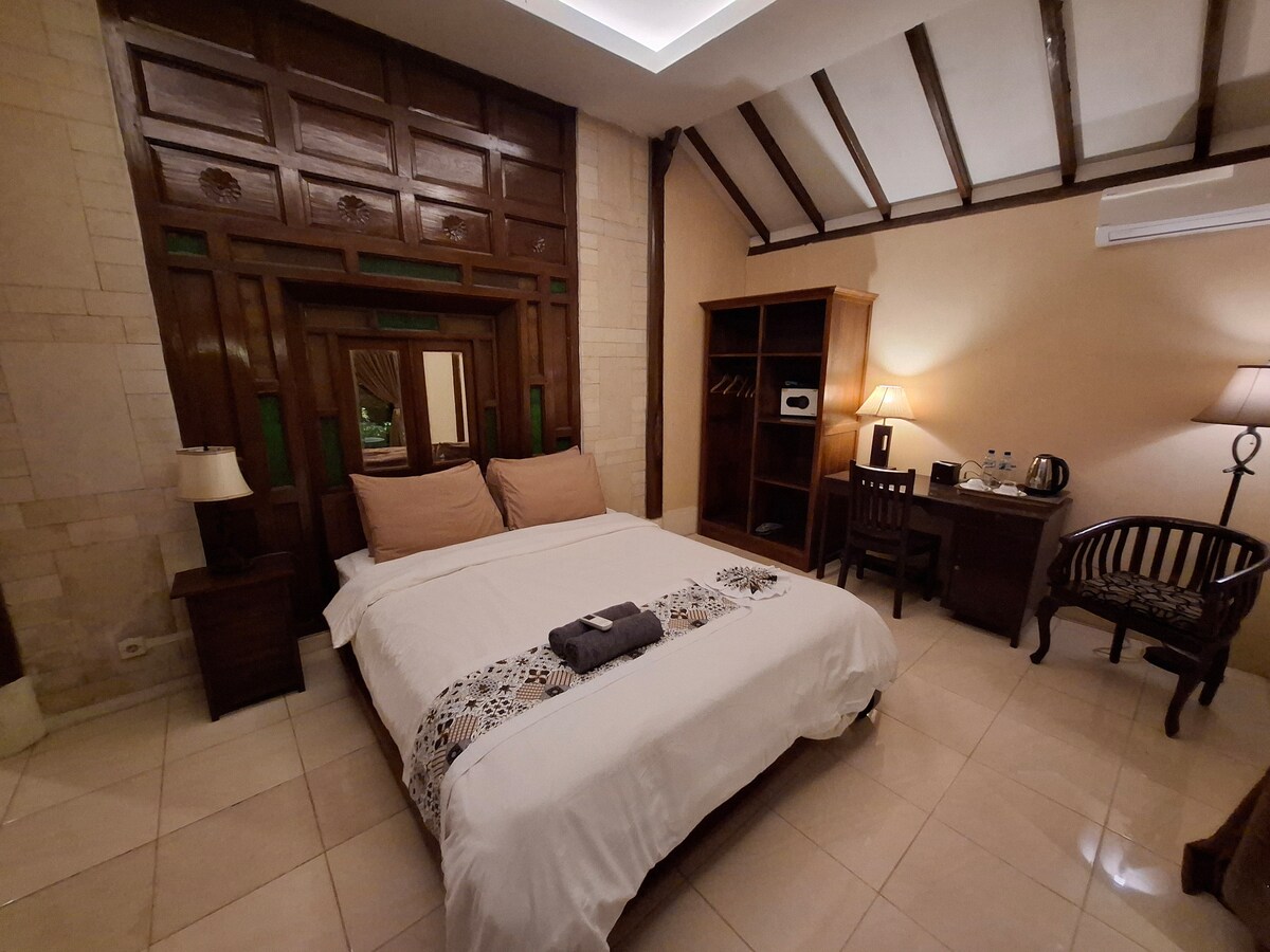 Esta habitación tiene un dormitorio grande con un baño adyacente con ducha. Esta habitación está equipada con aire acondicionado y una televisión de pantalla plana. Esta habitación tiene vistas directas al templo de Borobudur, así como al monte Sumbing. Esta habitación está rodeada por un gran jardín privado y la exuberante selva javanesa.