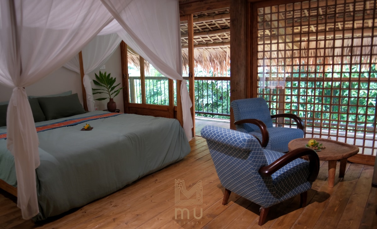 A private bungalow, standing alone beside the stream. Just you, the balcony, and rice fields stretching toward the quiet village beyond. 35m² for two. A queen bed, a wooden bathtub — every piece of furniture in the room handcrafted by local artisans. Hot water, heater and fan throughout. Breakfast, local coffee and tea prepared and waiting. Your own private space, just the two of you — and everything else can wait.