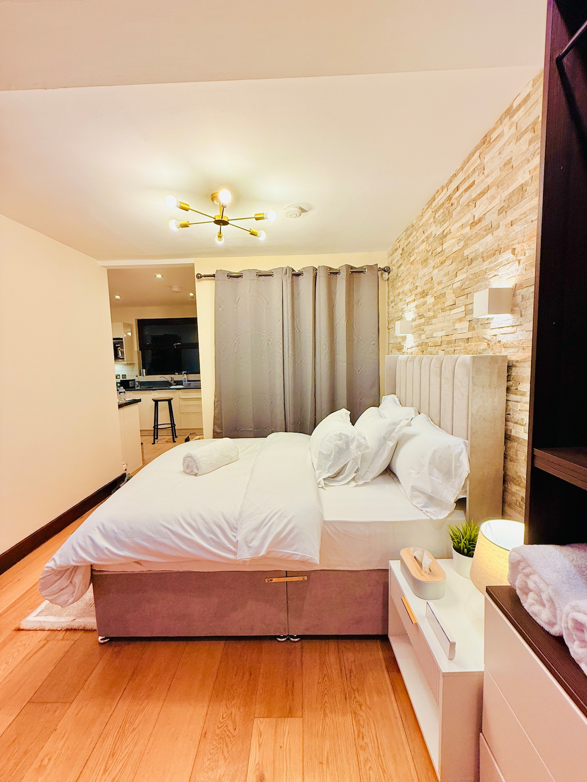 El Grande Studio en Roomzzz Stratford ofrece un espacio espacioso y cuidadosamente diseñado, perfecto para estancias prolongadas o mayor comodidad. Con una superficie de aproximadamente 31 metros cuadrados, cuenta con una lujosa cama tamaño king, un elegante baño privado, una zona de cocina totalmente equipada y un espacio de trabajo. El diseño moderno combina estilo y practicidad, lo que garantiza una experiencia relajante y lujosa.
