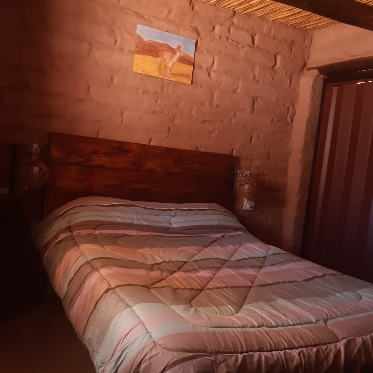 Rancho para 2 personas en un predio de 4000 mts cuadrados, con una increíble vista de las montañas de la Paleta del Pintor, en medio de un campo de cultivos y corral de llamas, construidos con un estilo andino, con materiales locales como adobe, caña y piedra, calefón solar y uso eficiente del agua.