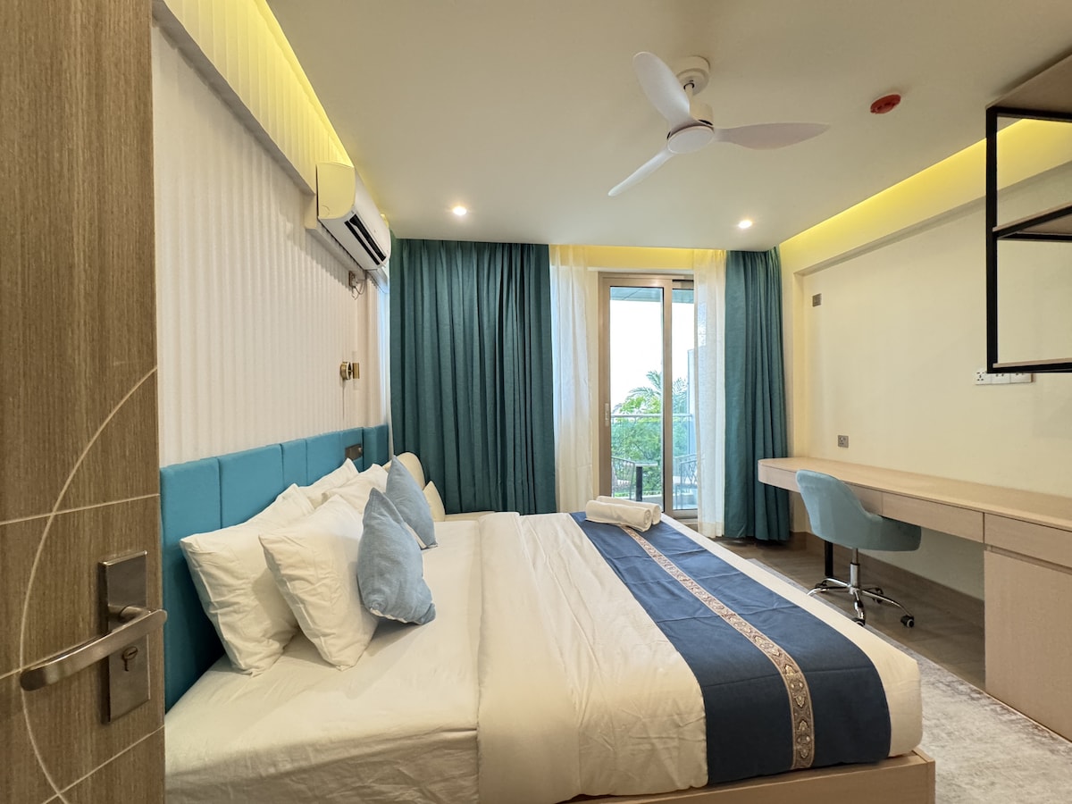 Perfect for vacationers, business travellers, or those in transit, this stylish 1BR retreat offers serenity few steps from the beach in beautiful Hulhumale'. Unwind in a spacious, tranquil space designed for relaxation. Enjoy a fully functional kitchen, cozy sitting room, Wi-Fi and a master bedroom with a queen-sized bed and attached bathroom, all complemented by partial ocean views. With popular cafes, restaurants, and shops nearby, your ideal beach getaway awaits at Biosphere Haus.