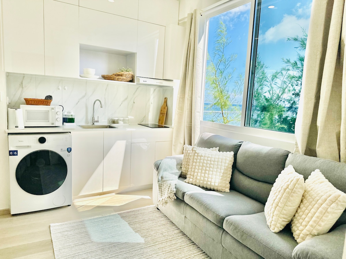 Relájate y desconecta en este alojamiento tranquilo y elegante. Hay un modesto y pequeño juego de cocina totalmente funcional, un dormitorio con una cama tamaño queen y una cama plegable donde 2 a 3 huéspedes pueden disfrutar de una vista increíble. Disfruta del lado soleado de la vida con Lazzlla. El edificio se encuentra justo enfrente de la playa y el mar. Esta unidad incluye: 1 cocina pequeña totalmente funcional 1 sala de estar 1 dormitorio principal con cama tamaño queen extraíble y aseo adjunto 1 aseo de invitados.
