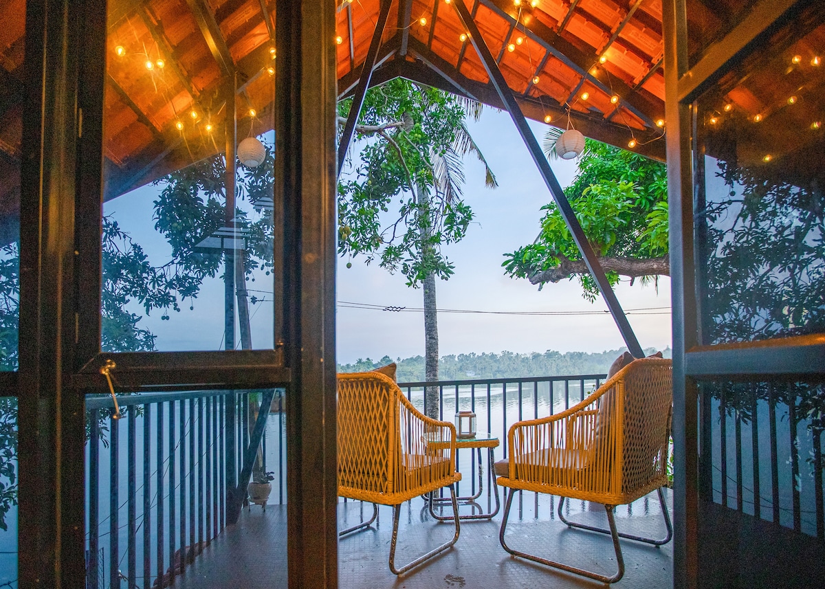 Lakebreeze Stays: Cozy A-Frame style villa by Ashtamudi Lake >Panoramic lake views balcony/patio >Lakeside hammock >Workspace + 100 Mbps Wi-Fi >Tea & Coffee kits >AC beds w/ premium linens & toiletries (bath only) >Full kitchen w/essentials, BBQ(fee) >Complimentary Kerala breakfast >Caretaker on call >Inverter (lights/fans) >Free off-site parking (1 small car/comp SUV) >Online Food/grocery serviceable, Handyman services > Cab/auto (tuk-tuk) tie-ups * No TV/washer * 100 m walk (no car access)