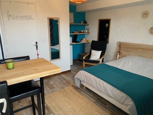 Pequeña casa de una sola planta (el piso no es accesible) unos pocos escalones para acceder a la puerta de entrada. Ideal para una pareja, pero se pueden añadir cómodas camas de campaña para acomodar a 2 niños. El alojamiento consta de 2 habitaciones: - 1 habitación grande con zona de escritorio y zona de TV - 1 cocina grande totalmente equipada También encontrará un baño con ducha italiana e inodoro. Una terraza en la parte delantera y una terraza en la parte trasera le darán la bienvenida para un momento de descanso.