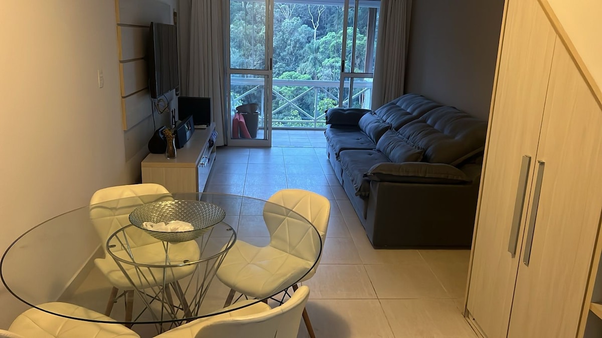 Apartamento confortável de 2 quartos, no melhor resort de Mangaratiba. Infraestrutura completa para a família, amigos e crianças. Temos 2 suítes, 1 banheiro social, 1 sala de estar, 1 cozinha completa e uma varanda vista mar. Todos os quartos possuem ar condicionado e armários. Roupa de cama e banho inclusas na hospedagem. Dá para acomodar mais 2 crianças na sala com colchonete e/ou sofá cama caso seja necessário ou 1 adulto, além dos 4 hóspedes, com um custo adicional (verificar com anfitriã).