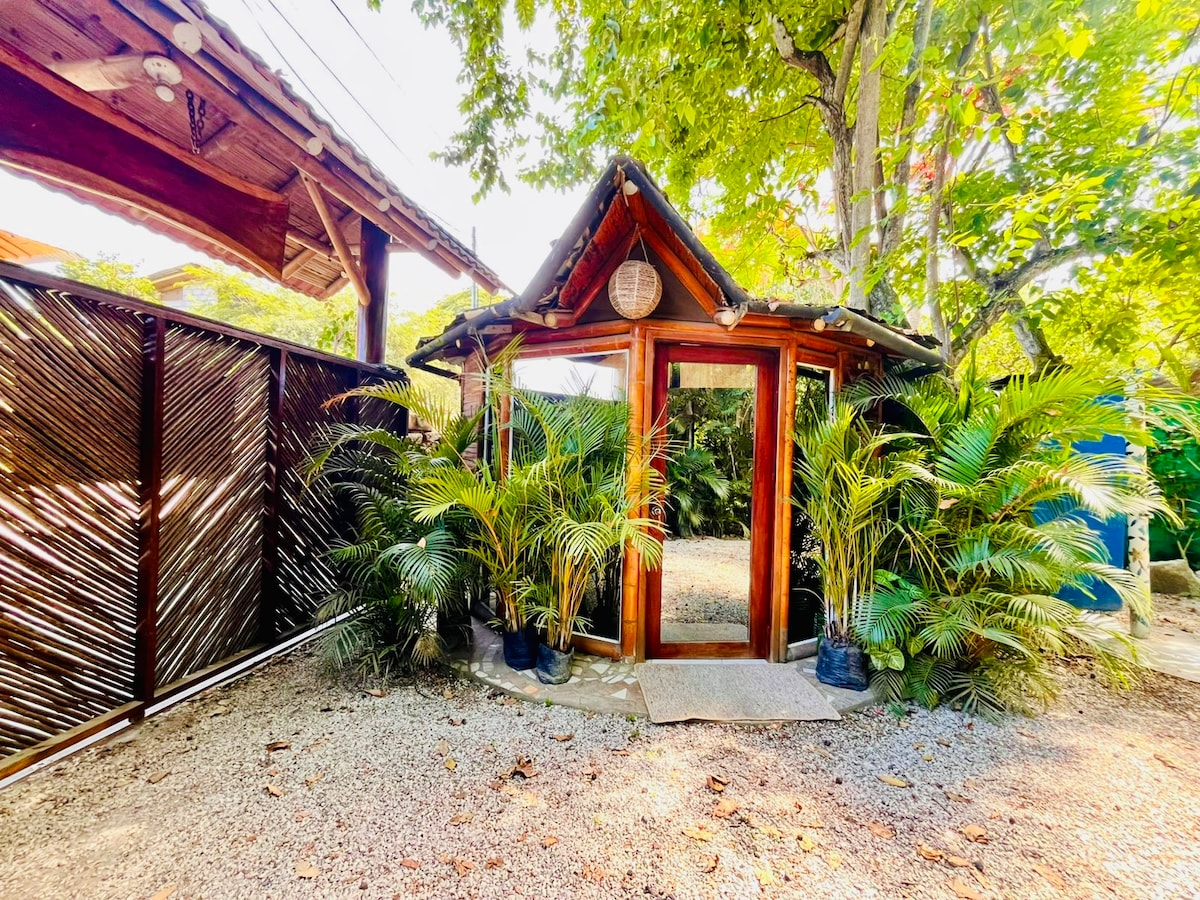 Casita de Bambu*piscina * cabaña * oasis verde * 2 minutos de playa