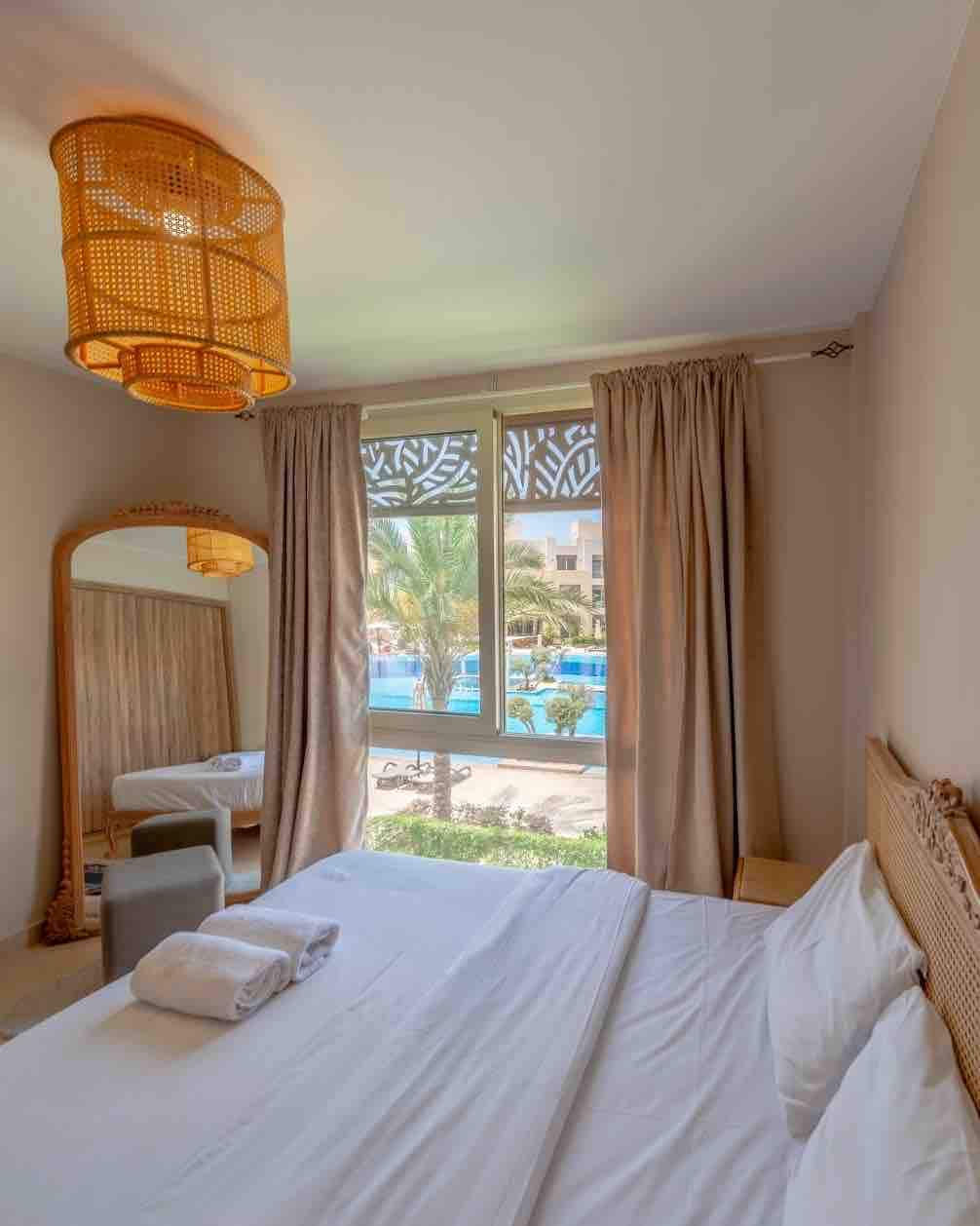 Este apartamento neutral con vista a la piscina y al mar de 1 dormitorio está en la playa de Gouna con piscina gratuita y acceso a la playa. NOTA: De acuerdo con las reglas de la comunidad de Mangroovy, Es necesario que las parejas egipcias proporcionen un certificado de matrimonio, las nacionalidades extranjeras no necesitan un certificado de matrimonio. NOTA: TODOS los huéspedes deben enviar sus identificaciones 48 horas antes del check-in para la entrada de la puerta con código QR de Gouna. (Si la seguridad de la comunidad no lo aprueba, el huésped debe iniciar la cancelación y recibirá un reembolso total).